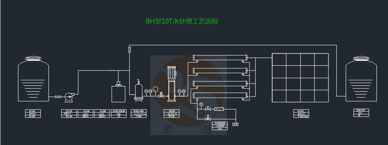 本設計采用 “原水箱——增壓泵 —— 石英砂過濾器  —— 活性炭過濾器 ——全自加藥裝置——精濾——反滲透膜——純水箱 的工藝。此工藝可達到出水水質穩定,電導率低的目的。